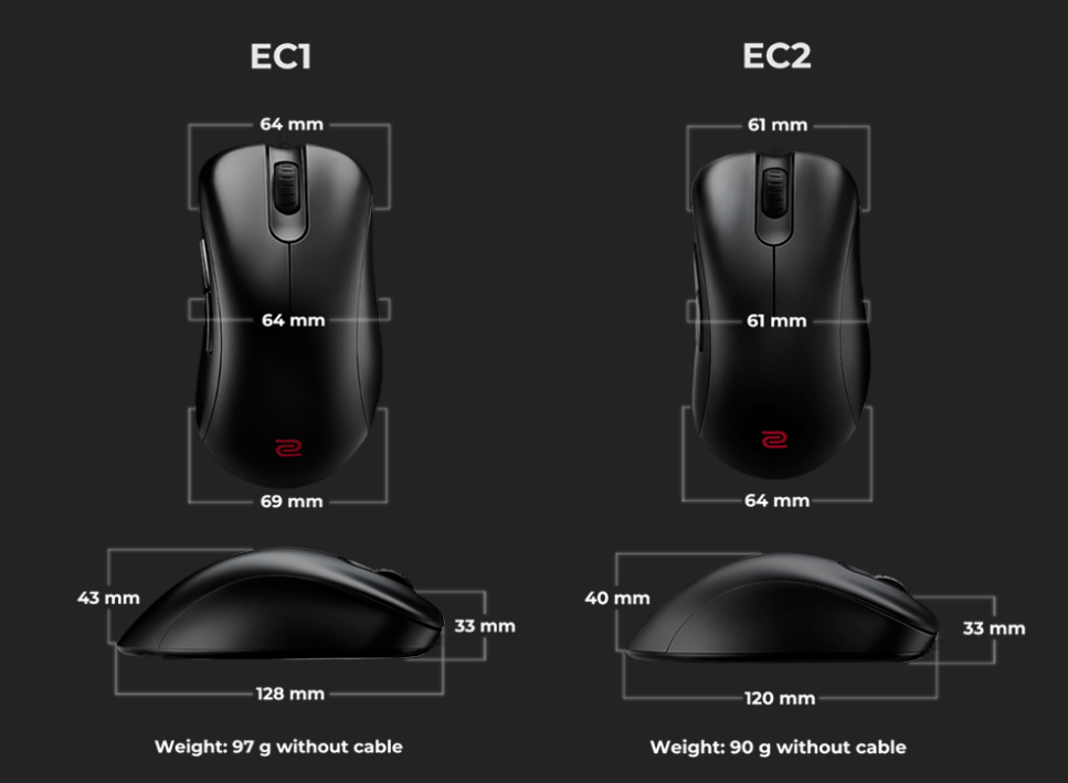 EC시리즈의 경우 비대칭형의 마우스로 그립감이 매우 좋기로 유명한 마우스입니다. 적당한 등 높이와 완전한 팜 그립에 어울리게 설계된 쉘 덕에 많은 저감도 유저들이 사용하는 마우스입니다.