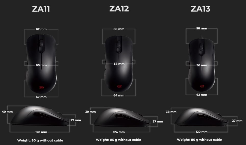 ZA시리즈의 경우 마우스 크기보단 손바닥이 마우스 바디 부분과 접촉한 뒤 손가락은 마우스와 떨어져 있기 때문에 마우스 사이즈와 손 사이즈가 비례하지 않아 추천하기 어려움.